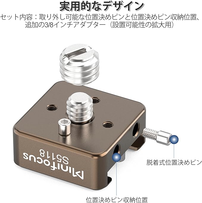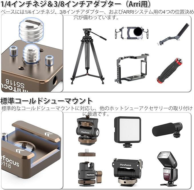MINIFOCUS コールドシューマウント(2個セット)、位置決めピン付き1/4「-20ネジ、ARRI標準マウントポイント対応、カメラケージ・フラッシュ・LEDモニター・マイク用3/8」-16アダプター付属