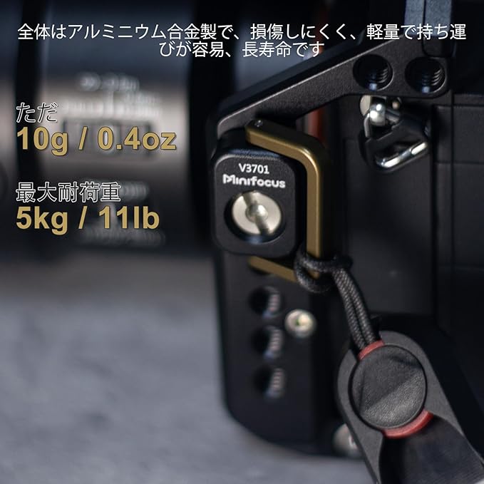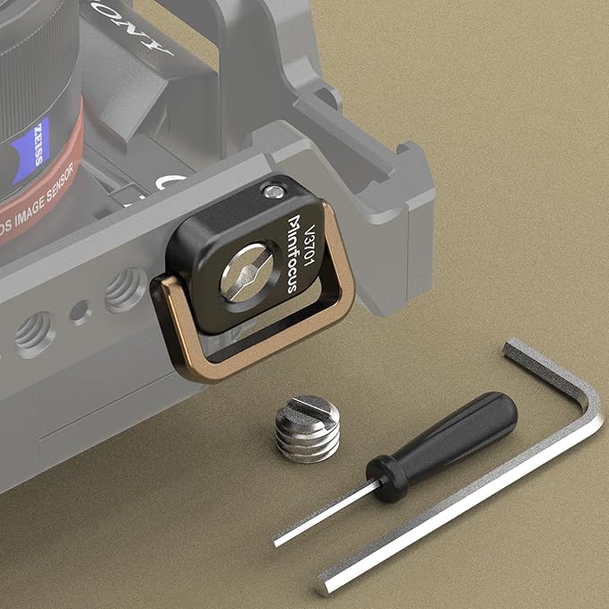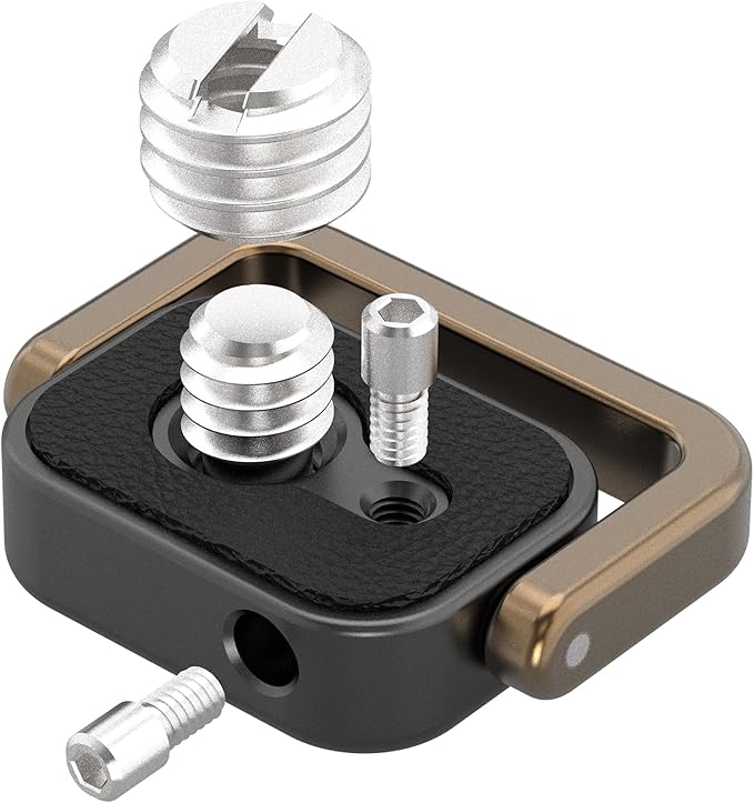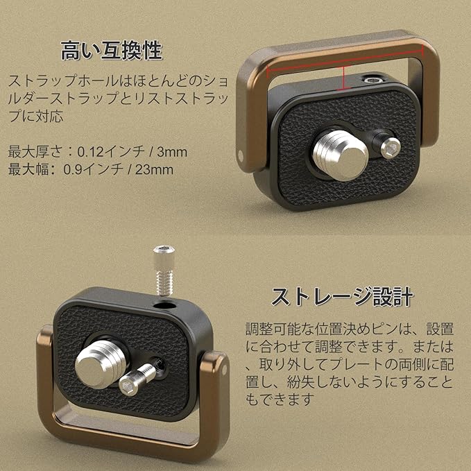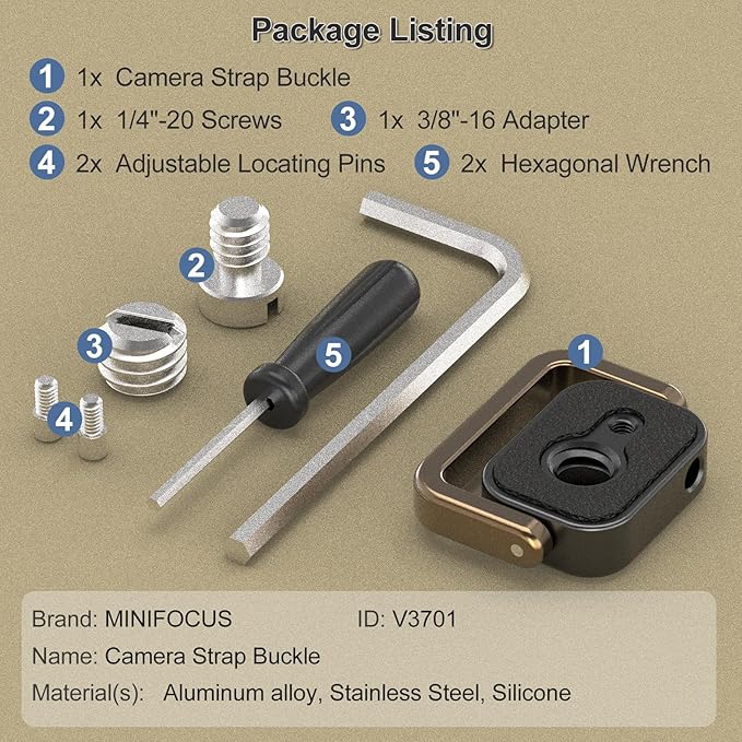 パッケージ内容:1/4インチのネジ(カメラのストラップ穴用)、3/8インチのアダプター、調整可能な定位ピン2本、六角レンチ2本。ほとんどのカメラの1/4インチのネジ山に適合し、ストラップとカメラを接続できます。写真撮影や動画撮影をより便利にする非常に実用的なアクセサリーです。
