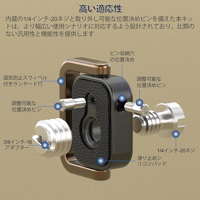 標準ねじ式ネジ:1/4「-20ネジと3/8」-16アダプターが付属しており、GoPro、Insta360、ほとんどのカメラ、および標準ねじ式アクセサリーとの接続が便利です。2つの調整可能な定位ピンが装備されており、取り付けに合わせ調整可能です。または、取り外してプレート両側に配置することで、紛失を防ぐことができます。