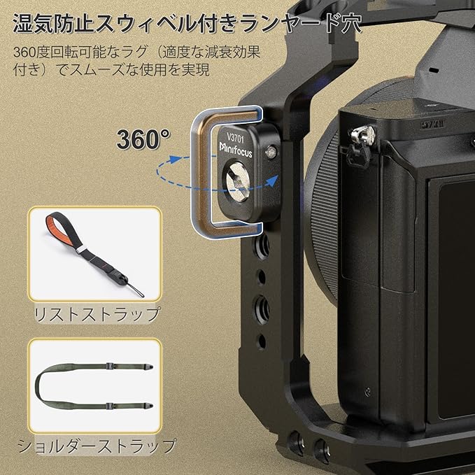 湿気防止のストラップ穴:調整可能なストラップ穴は、360 滑らかに回転可能です。このストラップ取り付け部は、幅0.9インチ(23mm)未満のサードパーティ製カメラ用バックストラップ、ショルダーストラップ、またはリストストラップに対応し、ストラップの取り付けと取り外しをより便利に行えるように設計されています。