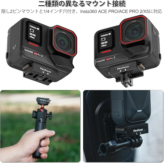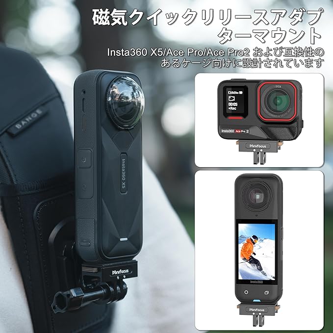 幅広い互換性:Insta360 X5、Ace Pro、Ace Pro 2カメラの形状に完璧に適合するよう設計され、揺れを心配することなく確実に固定できる磁気式固定爪を備えています。