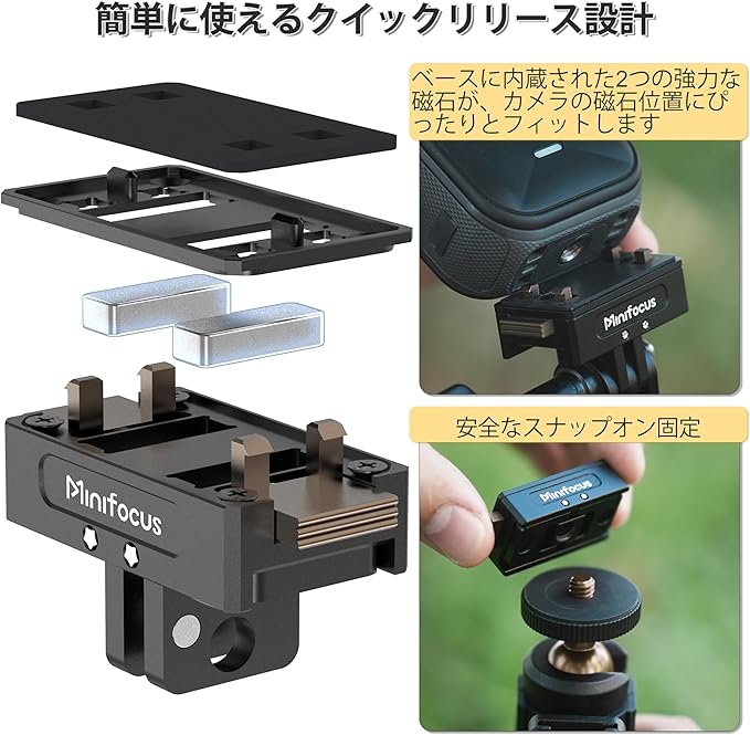簡単取り付け:マグネット式クイックリリースベースは操作が簡単。両端のリリースのボタンを同時に押すだけで簡単に取り外し可能。撮影をより楽しく、後悔のない記録と創作を実現します。