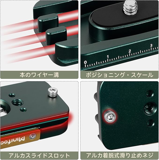 [互換性] カメラクイックリリースプレートは、アルカスイス標準アリミゾ式クイックリリースクランプと完全に互換性のある1.5 "アリ溝を内蔵し、ヘッドはボールヘッドモデルのアルカタイプクイックリリースエレメントに適合します。最大サイズは約76x42x12 mm、重量は約65 g/0.14 lbです。パッケージを含む 1xカメラケーブルロッククランプ、1x六角レンチ
