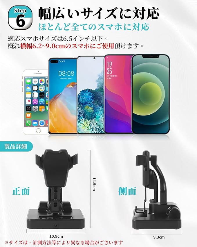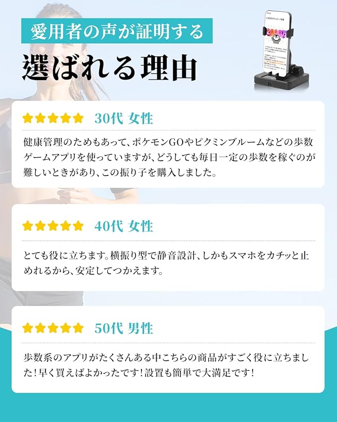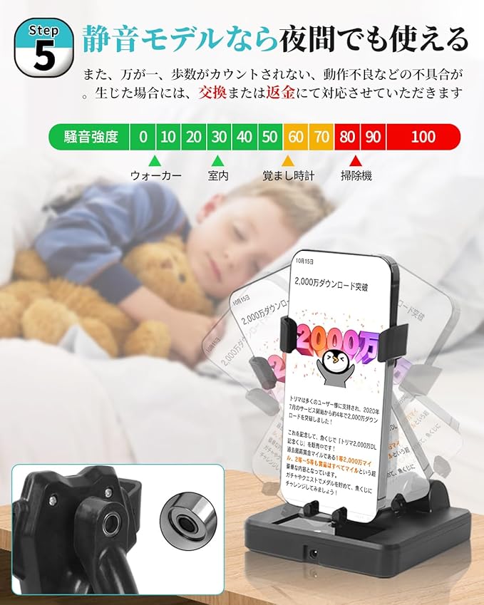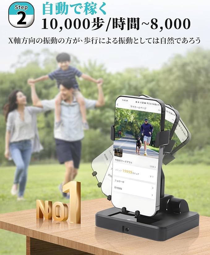【幅広いスマホ対応・滑り止め強化】幅約 6.2~9cm・厚さ約 12mm まで、iPhone・Galaxy・Android などほぼ全機種対応。画面サイズ 7.2 インチ以下に対応し、滑り止め構造を搭載して装着時のズレを防止。保護ケースが厚い場合はケースを外してご使用ください。安定した横揺れ動作で、歩数計測アプリや歩数連動ゲームの補助に最適です。