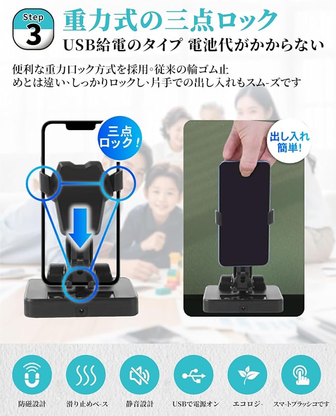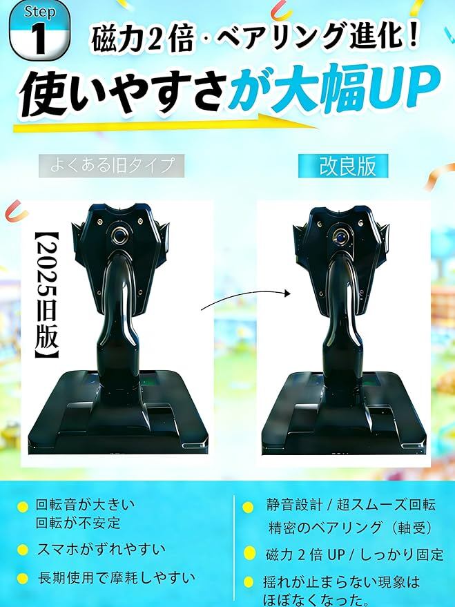 【2026 革新 静音設計・強化軸受&磁力アップ】従来モデルの動作音を大幅に抑えるため、スタンド構造を最適化し、高耐久強化軸受を採用。回転時の摩擦を大幅に軽減し、極めて静かでスムーズな回転スイングを実現。安定した動作により長時間使用でもブレが少なく、静音設計なのでオフィスや寝室でも安心。耐磁保護構造でスマホへの影響を抑え、省電力 USB 給電で日常的に長時間ご利用いただけます。
