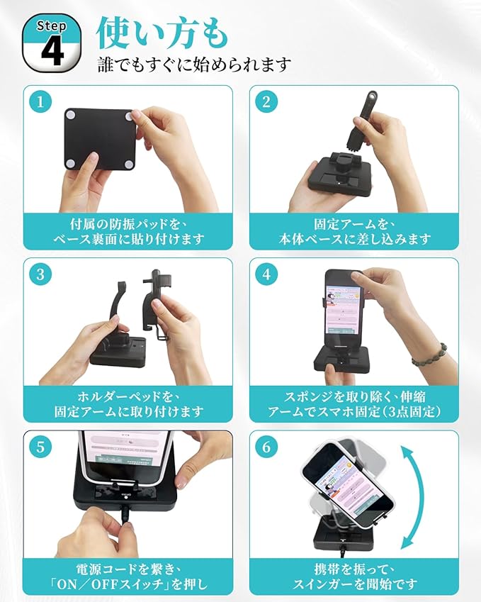 【伸縮式ブラケット・簡単固定・自動歩行】伸縮式ブラケットを採用し、スマホをセットするだけで簡単に固定。片手でも設置しやすく、安定した保持力でスムーズな回転スイングを実現。本体が自動歩行動作を行い、手を使わずに効率よく歩数稼ぎが可能。面倒な作業を自動化し、毎日のアクティビティを大幅に効率化できます。