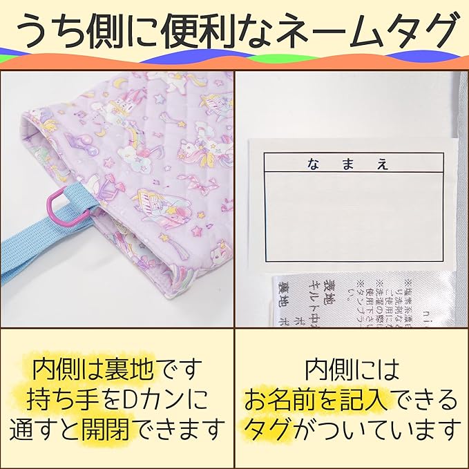 【シューズバッグ】キルティング生地。持ち手をリングに通すだけの簡単な仕様です。内側にはお名前を記入できるタグ付き。ポケットは付いていません。