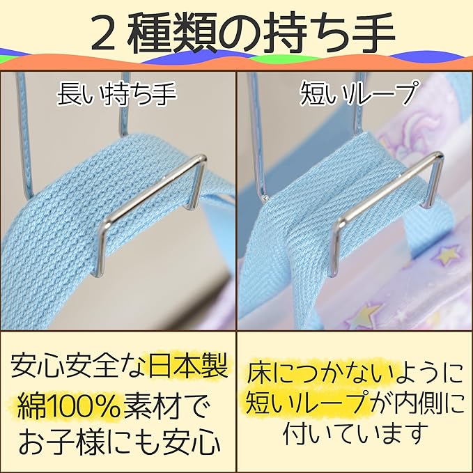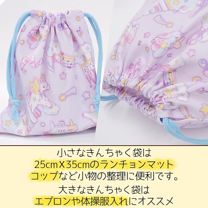 【巾着袋】(小サイズ)はコップや歯ブラシ、小物入れに◎!(大サイズ)は体操服や給食着・お着替え用にと様々な用途に使える便利な巾着袋♪内側にはお名前を記入できるタグ付き。