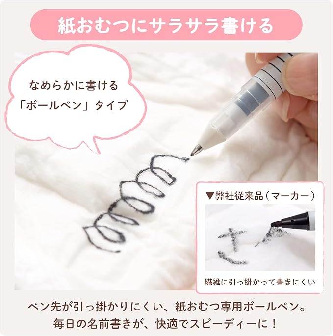 【特長1】保育園や子ども園などで使う紙おむつの名前書きに