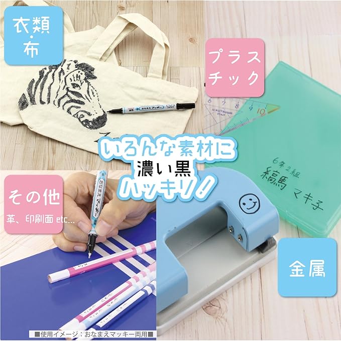 特に衣類(ハンカチ・ワイシャツ・体操着・運動靴など)の名前書きに適しています。ビニール、プラスチック、金属、革、ガラス、紙などにも利用可能。浮き輪などの軟質塩化ビニール製品には適さない。