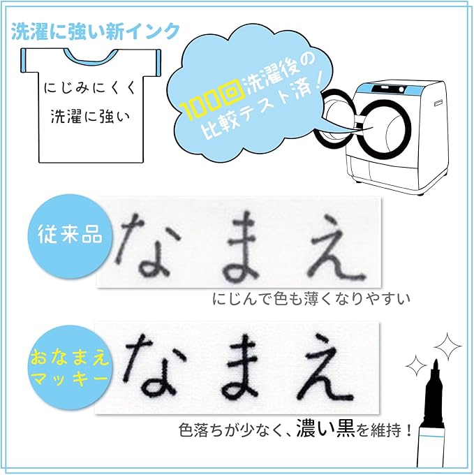 【特長】さらに強力!ハッキリ、濃い!にじみにくく洗濯に強い!/名前書き用油性マーカー