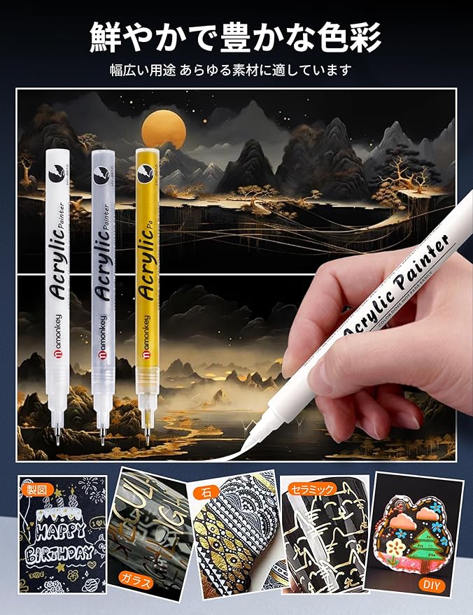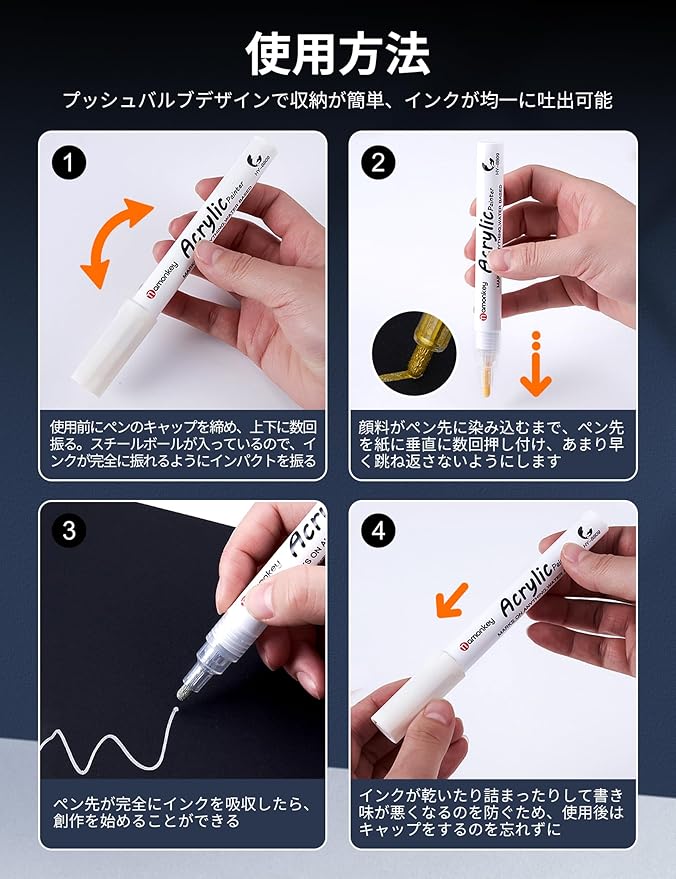 【鮮やかなインク】:ホワイトアクリルマーカーは色彩に富み、重く、鮮やかでしっとりしており、どのようにブレンドしても "汚い "感じや "グレー "な感じはしません。 着色層が油分を吸収したり汚れたりしません。乾燥後に重ね塗りすることで、さらに鮮やかな発色を実現できます。
