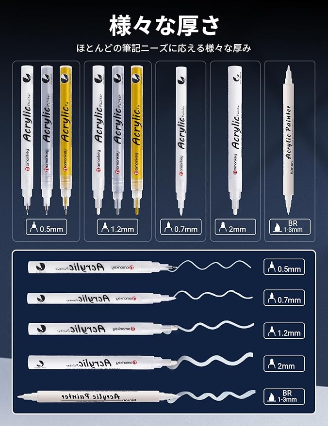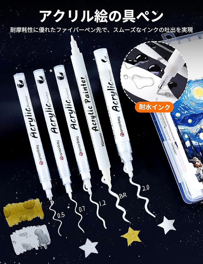 【耐水性、速乾性】:アクリルマーカーのもうひとつの大きな特徴は、コーティングが完了しインクが乾くと、不浸透性の皮膜を形成し、優れた耐水性を発揮することです。 色がもろくなったり変色したりすることなく長持ちします。(ガラスやプラスチックのような非吸水性の素材に書くと、乾燥に時間がかかる場合がありますのでご注意ください)