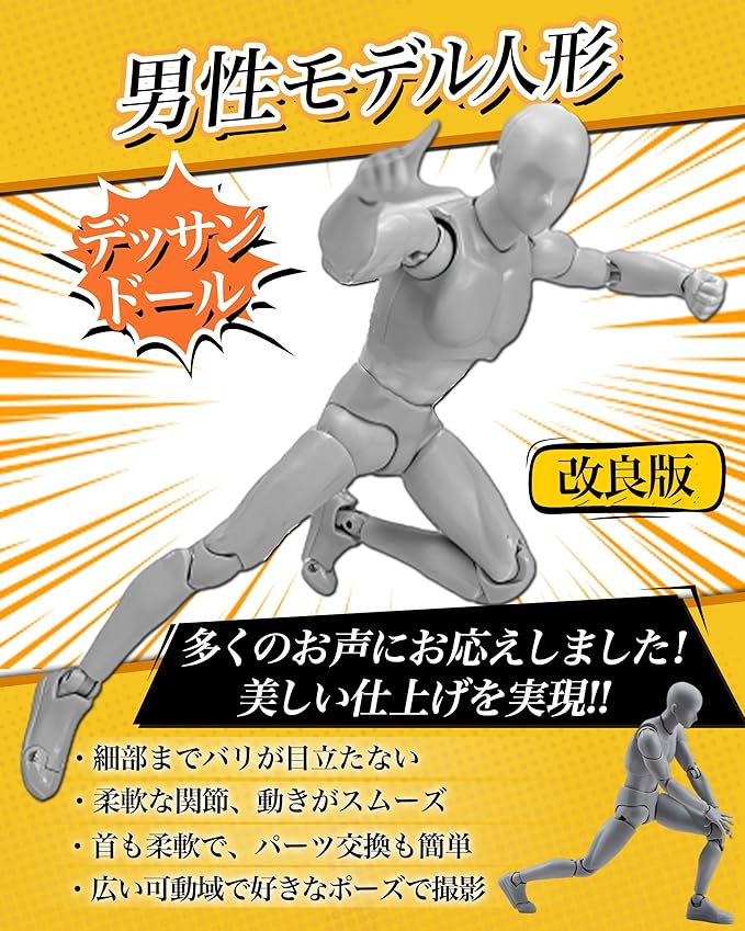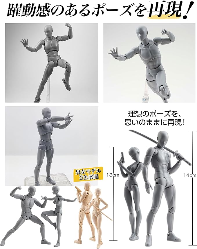 ✅【全身改良版!圧倒的な30可動関節】 「バリの目立ち」「関節の緩さ」「パーツ交換の難しさ」「可動の硬さ」といったお声に応え、改良を重ねました!!全身30ヶ所以上の関節にこだわり、あらゆるポーズを再現。あなたの思い通りにポーズを決められ、あらゆる角度からの観察とデッサンを可能にします。男性モデル:全長約14cm、女性モデル:全長約13cm。★便利な付属品:デザインナイフ(刃1枚付き)、仕上げの細かなバリ取りに最適!※ご使用の際は、ケガに十分ご注意ください。コンパクト(約13-14cm)で軽量(約100g)なため、収納や持ち運びにも便利です。