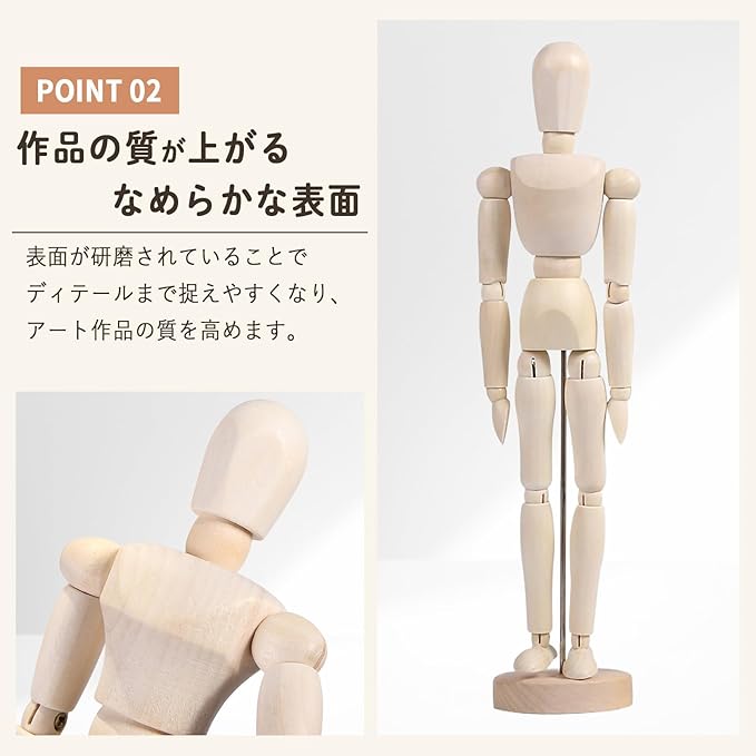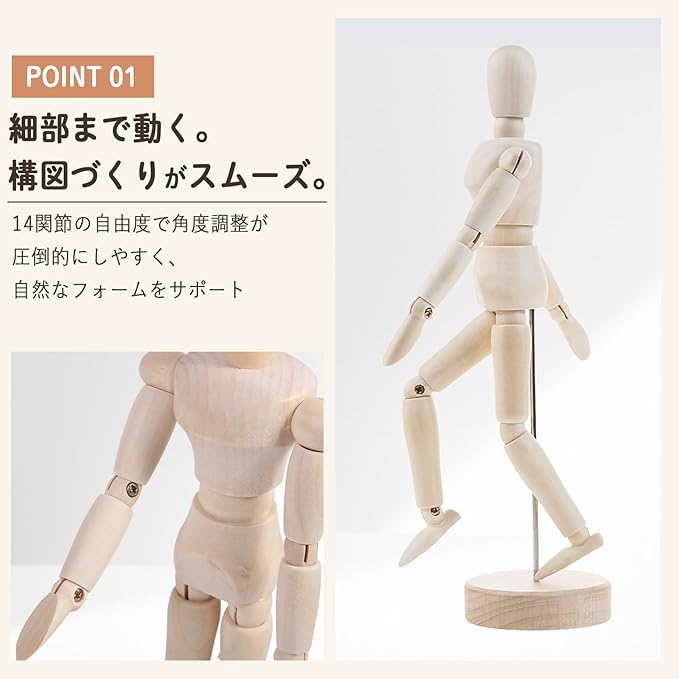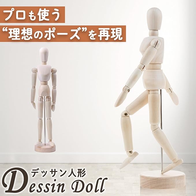 アーティストやイラストレーター、複数人での使用にもおすすめの木製デッサン人形です。 人間の体をリアルに再現した造形で、14箇所の可動関節により、自然で多彩なポーズを自由に再現可能。デッサン・漫画・アニメ制作など、幅広い創作活動の練習に最適です。