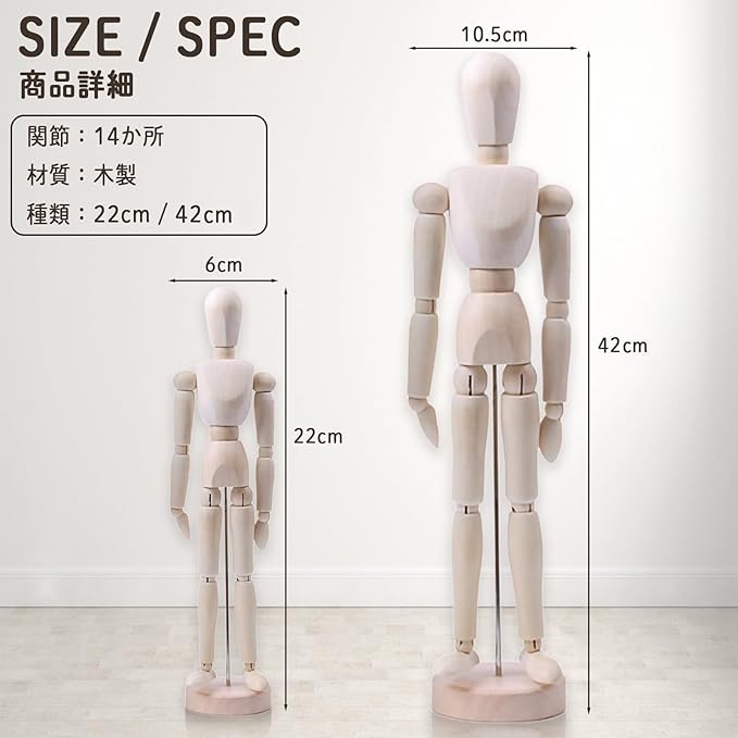 サイズは人形本体の高さ約41.0cm(台座込み約42cm)と本体20.5㎝(台座込み約22cm)の2サイズをご用意。単体で安定した台座付きのため自立可能です。 練習用だけでなく、アクセサリースタンドや撮影小物としても人気。 あなたの描きたいポーズを思い通りに再現し、作品の表現力を広げてくれる定番アイテムです。