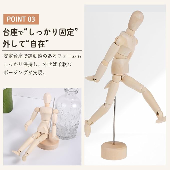 自由自在に変形できる関節構造で、走る・座る・跳ぶなどの動きを細かく表現できます。昔ながらの温かみある木製デザインで、インテリアとしてもおしゃれ。机の上に置いても馴染みやすいベーシックな質感です。