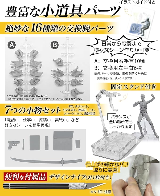 ✅【豊富な付属品で表現の幅が広がる・男性版・女性版の内容物】 本体、交換用右手首10種、交換用左手首7種、小物(ミニブック、PC、タブレット、ペン、スマートフォン等)、携帯電話、専用台座、ケース+手首ホルダーが付属。※ケースは台座で蓋をすることができます。気軽にパーツを取り替えて好きなポーズを取らせることが可能。手足のパーツも豊富で、指先の細かい動きまでリアルに表現できます。パーツ交換は簡単で、思い通りのポーズを簡単に再現可能。対象年齢:15歳以上