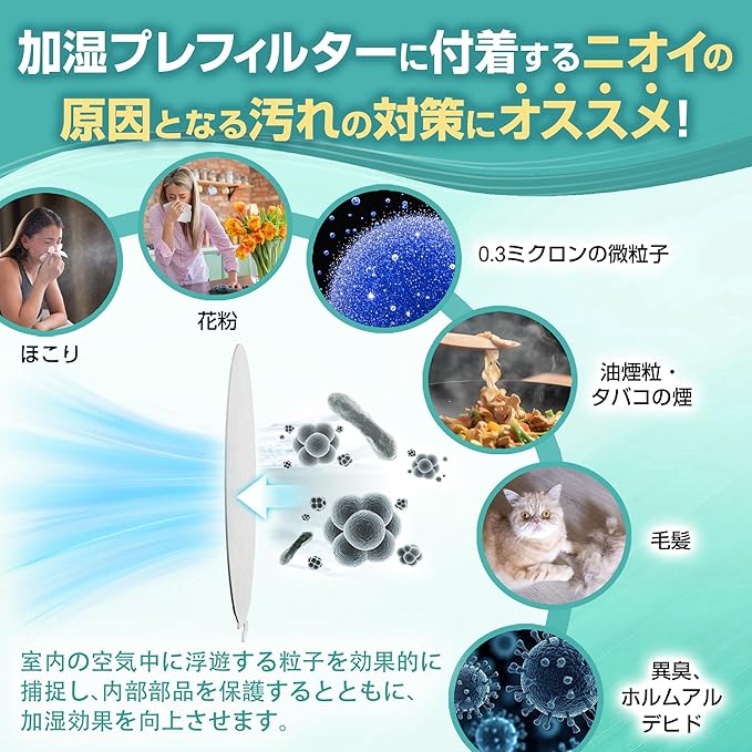✅【加湿空気清浄機のプレフィルターの機能】室内の空気中に浮遊する粒子を効果的に捕捉し、内部部品を保護するとともに、加湿効果を向上させます。ニオイの原因となる汚れが加湿フィルターに付着するのを軽減し、常に清潔な状態でご使用いただけます。さらに、空気をろ過してほこり、花粉、0.3ミクロンの微粒子、アレルゲンを除去し、毛髪、異臭、ホルムアルデヒドも効果的に取り除きます。