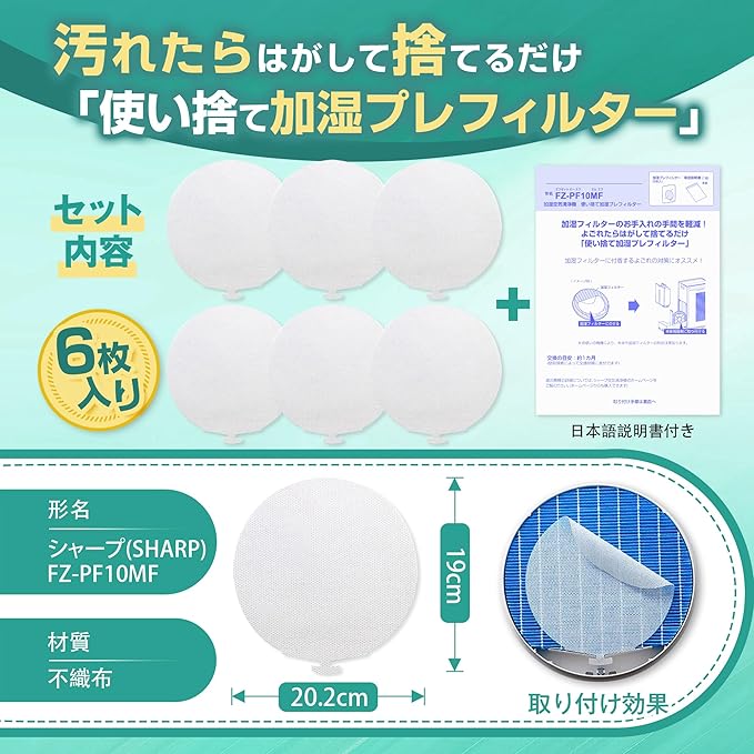 ✅【加湿空気清浄機用 使い捨て加湿プレフィルター】●セット内容:使い捨て加湿プレフィルター 6枚入り、日本語説明書付き。汚れたらはがして捨てるだけ「使い捨て加湿プレフィルター」は、加湿フィルターのお手入れの手間を軽減!お手入れをしても黒い汚れが取れない場合、カビや細菌が繁殖している恐れがあります。定期的なフィルター交換をおすすめします!