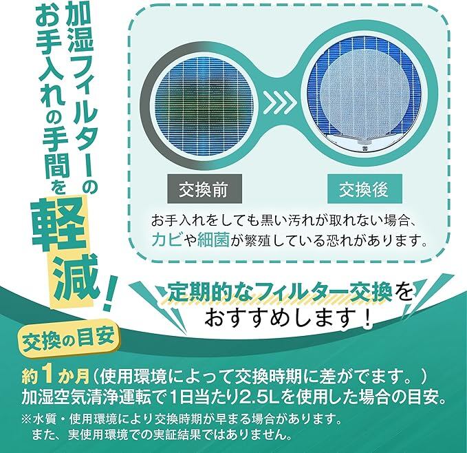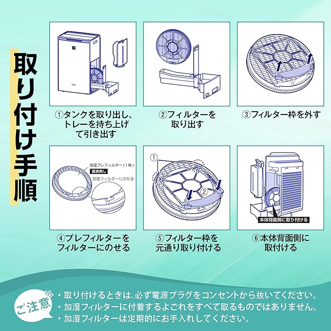 ✅【ご注意】・加湿フィルターに付着するよごれをすべて取るものではありません。・加湿フィルターは定期的にお手入れしてください。・取り付けるときは、必ず電源プラグをコンセントから抜いてください。