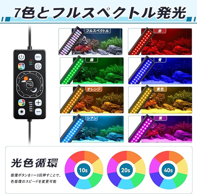 【調光可能】水槽用ライトは、赤・青・緑・オレンジ・黄・シアン・紫・フルスペクトルの8色を自由に調整できます。7つの固定単色とグラデーション照明機能を備えています。循環ボタンを1~3回押すことで、色変化の周期を10秒・20秒・40秒から簡単に設定できます。さらに、明るさは10%-25%-50%-75%-100%の5段階で調光でき、お好みの照明効果を簡単に作り出せます。