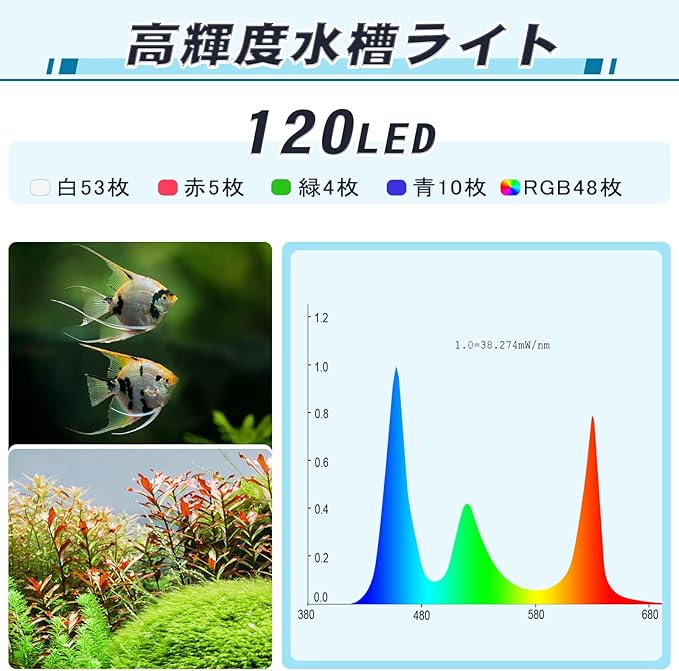 【超高輝度&高演色性】RGB水槽ライトは、3列の2835LEDと2列の5054 WRGB LEDを配置し、1360ルーメンの明るさで水槽をくまなく照らします。魚や水草の鮮やかな色彩を引き出し、視覚的に美しいアクアリウムを演出し、淡水水槽や水生植物の育成に最適です。
