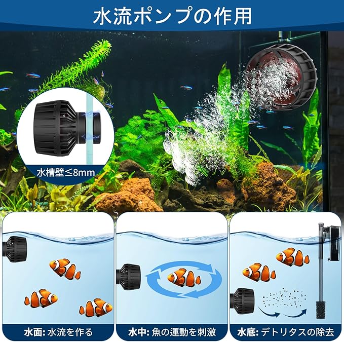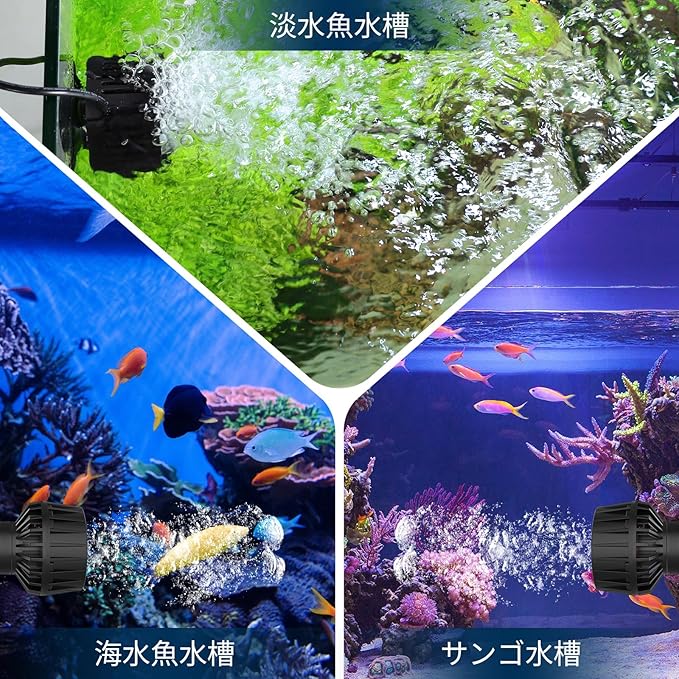 【自然水流】循環ポンプは最大流量は8000L/Hで、自然の水流をリアルに再現し、魚や水生生物にとって快適な環境を提供します。水槽内の水を効率的に循環させ、フィルターがゴミを吸い込みやすくするため、水質をクリーンに保ちます。さらに、静音設計により、寝室や静かな空間でも使用可能で、睡眠を妨げません。
