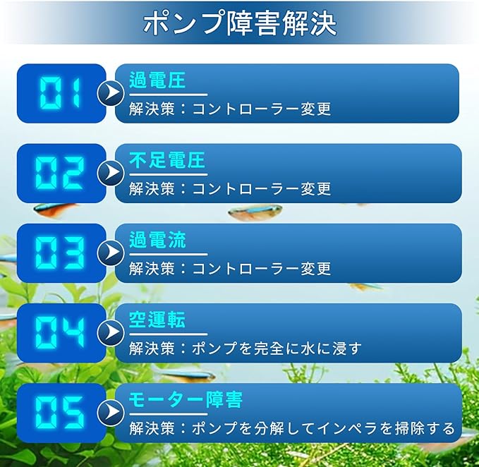 【4水流モード】水流ポンプには、01-固定水流、02-パルス、03-正弦波、04-ランダムの4つの波形モードがあります。「M/FE」ボタンで波形モードを選択後、「+」「-」ボタンで流量/周波数をF01~F10の範囲で調整可能です(01モードは流量調節、02/03/04モードは周波数調節に対応)。「M/FE」ボタンを長押しすると、9分間のフィードモードが作動します。