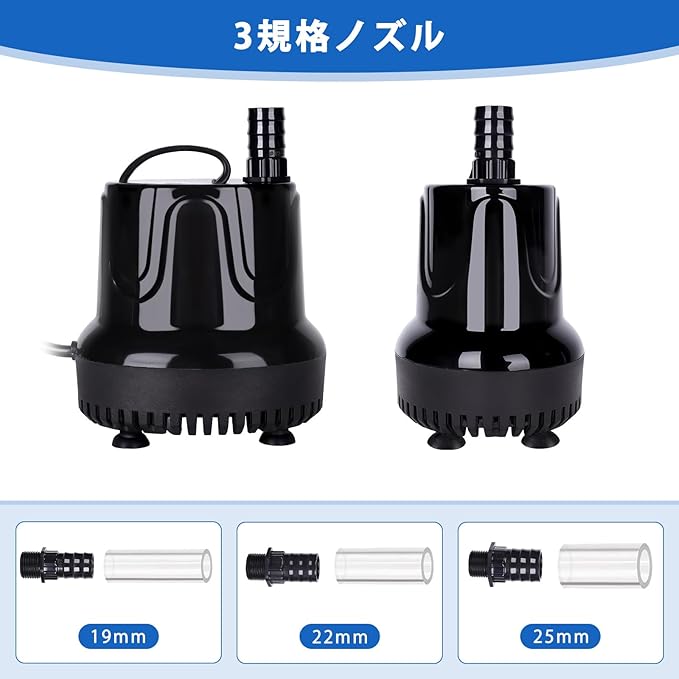【安定性高い】給水ポンプは19mm、22mm、25mmの3つの異なるノズルを含みます。各ノズルのサイズによって提供する水の流れも違います。ごニーズに応じて選択することをお勧めです。水槽ポンプの底部には強力な吸盤が4枚付き、安定性が高く、騒音低減効果が良いです。水槽壁にしっかりと固定され、適度な水流を作ることで、魚たちがより活発に泳ぐ姿が楽しめます。