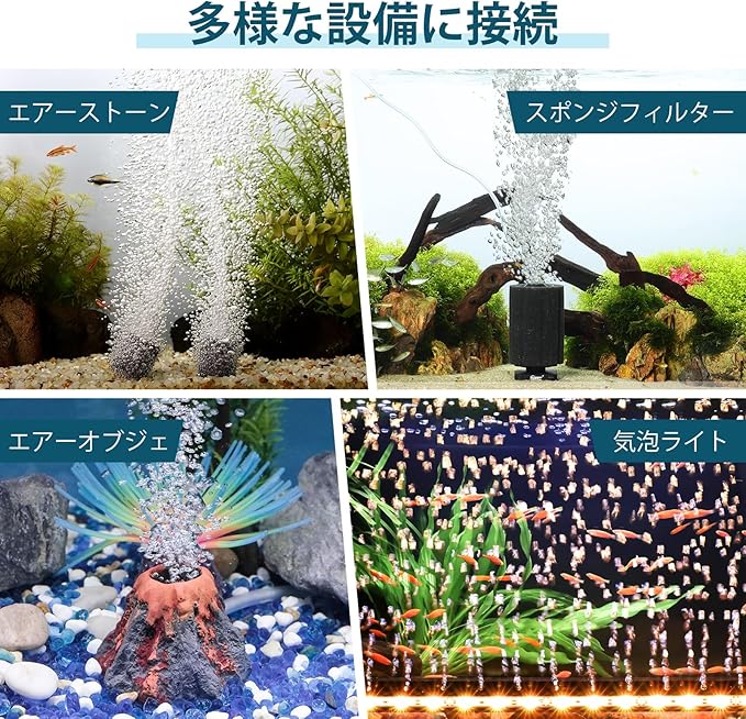 【2口送風】水槽エアーポンプは大容量エアー室を搭載し、内径4mmチューブ対応の独立2口を装備し、複数の水槽にエアーを供給できて酸素溶解効率を最大化します。さらに、水流を作り出すことで水槽内の淀みを解消し、水質悪化を抑制するだけでなく、好気性バクテリアに酸素や有機物を届けて活性化を助け、有機物分解を促進します。