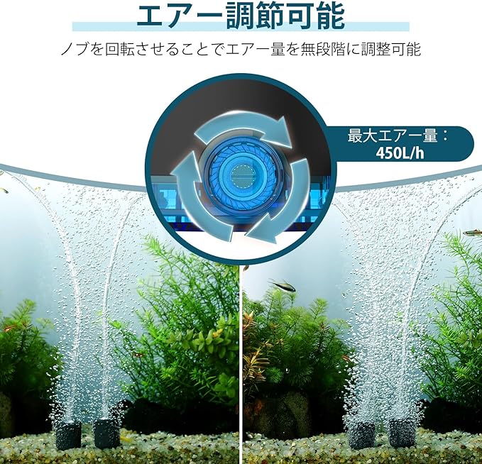 【強力ポンプ】エアーポンプには調節ノブを搭載しており、回転させることでエアー量を無段階に調整可能です。毎分最大約7.5Lの安定した吐出量を実現して最大450Lの水槽に対応します。ニーズに合わせて自由にエアー量を調節できるため、エアーストーンやスポンジフィルターなどに接続して水槽や鯉の池、水耕栽培など多様なシーンで活用できます。