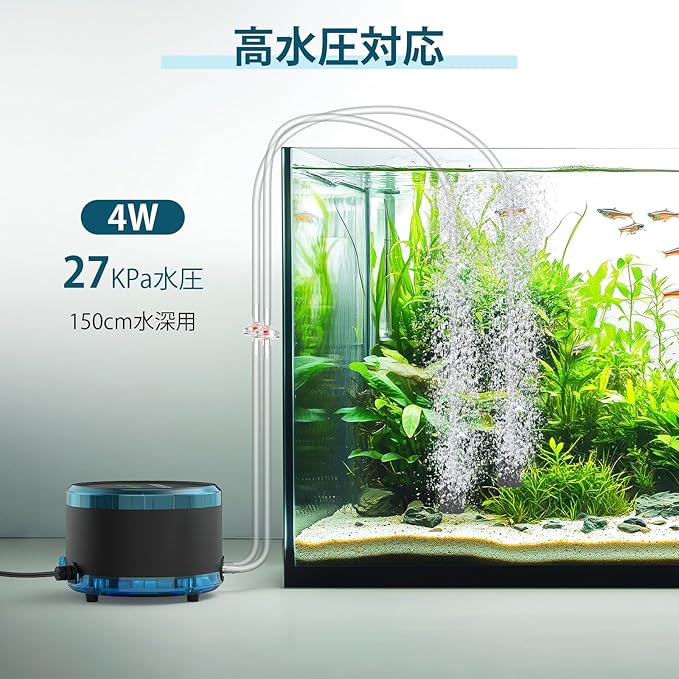 【省エネ&防水】4Wエアーポンプはコンパクトサイズながら0.027MPaの高水圧対応し、150cm以下の水槽に適用します。4Wの省エネ設計により、24時間稼働しても電気代を気にせず使用できるのも魅力です。また、IPX4防水で水しぶきに対応できます。さらに、付属の逆止弁が水の逆流を効果的に防止し、本体の水損リスクを軽減します。