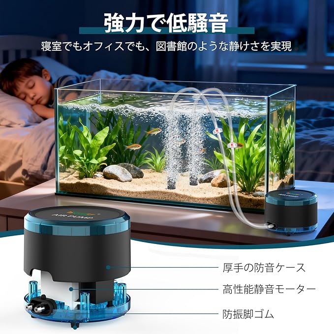 【35dB静音】ダイヤフラム駆動の強力ポンプです。内部の音を逃がさない防音室と厚いABSケースを採用し、特殊密閉構造により、運転中の騒音を大幅に低減します。また、振動を抑制する脚ゴムにより低振動を実現しています。ハイパワーながらも静かな環境で飼育できるため、寝室や書斎に設置する水槽にもぴったりです。