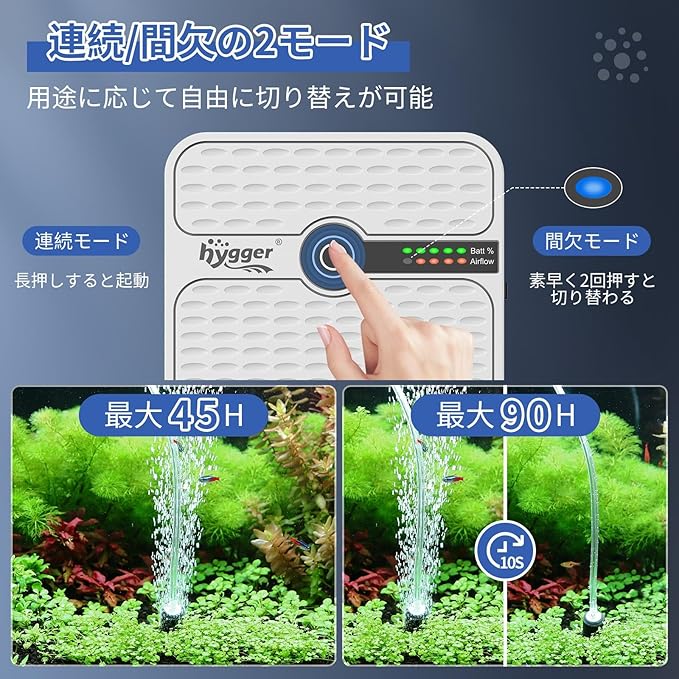 【連続/間欠モード】エアーポンプは連続モードと間欠モードの2種類の運転モードを搭載しております。電源ボタンを長押しすると起動して連続運転モードになり、素早く2回押すと間欠運転モードに切り替わります。間欠モードでは10秒作動した後に10秒休止するサイクルを自動的に繰り返します。