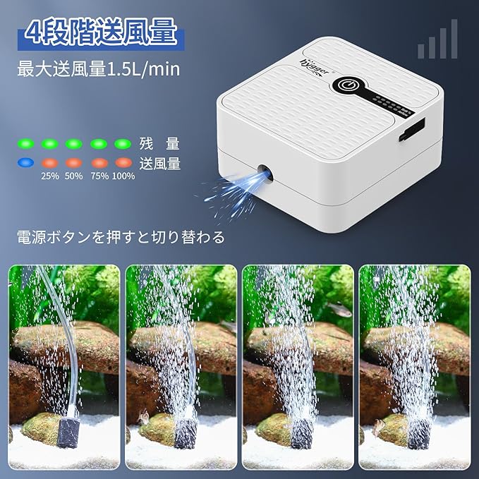 【最.大1.5L/min送風量】2600mAhバッテリー内蔵、エアーポンプの最.大送風量は1.5L/minで、水深90cm以内での使用を推奨いたします。軽量で持ち運びやすく、様々なシーンに対応可能です。水槽や屋外での釣り、魚運び、停電時の酸素供給に理想的なアイテムです。