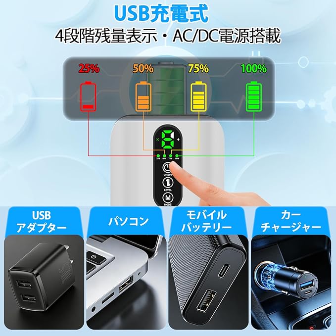 【6段階送風・USB充電】6段階送風の調節機能付きの酸素ポンプが便利です。USB充電式なので、スマホのように充電して使用できます。4つのランプが残量を表示してくれるので、充電し忘れのことが防止できます。本製品はAC電源を使用する通常のエアポンプとして動作可能で、停電時には自動でDC電源(電池駆動)に切り替わります。