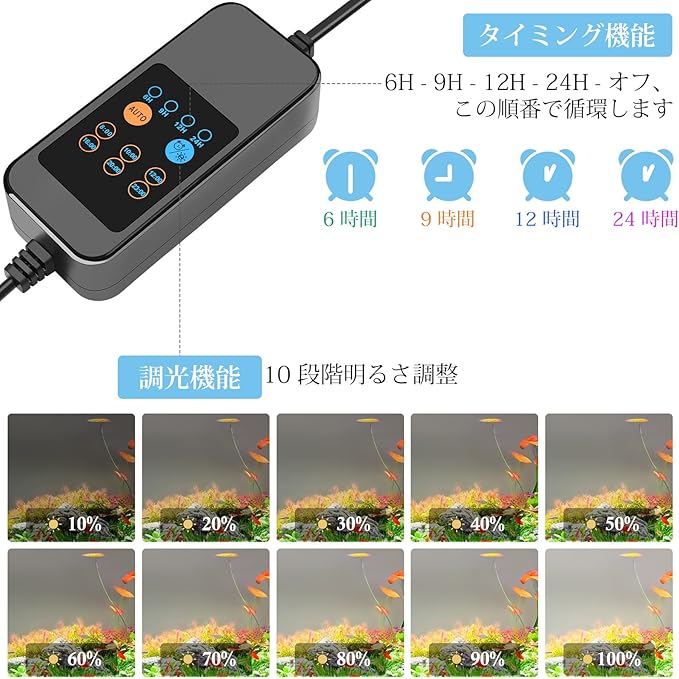 「タイマー&10段階調光機能」タイマー設定(6H/9H/12H/24H)で毎日一定の照明時間を維持可能。さらに10段階の明るさ調節が可能なため、魚や水草のニーズに合わせて明るさを自由に設定でき、より便利にご使用いただけます。