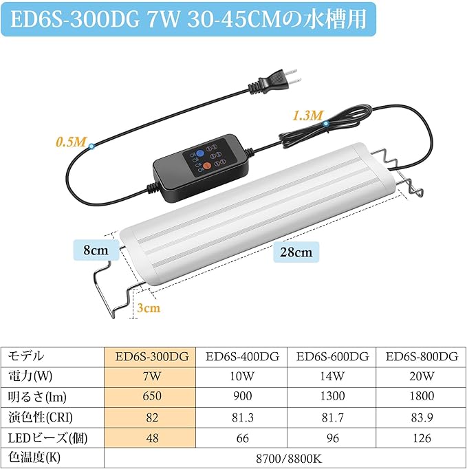 FEDOUR 7W 30cm 水槽用LEDライト、サイズ:28 8 3cm、30-45cm水槽適用。/ケーブル長:1.8m/RGBW LEDビーズ:48個(R12+G6+B10+W20)/ルーメン:650lm/CRI:82/色温度:8700K。この水槽ライトは魚や水草の色をより鮮やかに見せ、水槽の視覚的魅力を高めます。