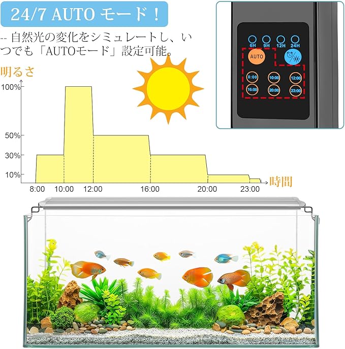 「24/7 自動モードによる自然光シミュレーション」AUTOモードは1日24時間を通じて日光の変化をシミュレーションし、自動的循環にします。このボタンを押して、現在時刻に最も近い設定時間を選択してください。AUTOモードをオンにした後、このLED水槽ライトは毎日同じ時間に自動で点灯・消灯し、その他の操作は必要ありません。