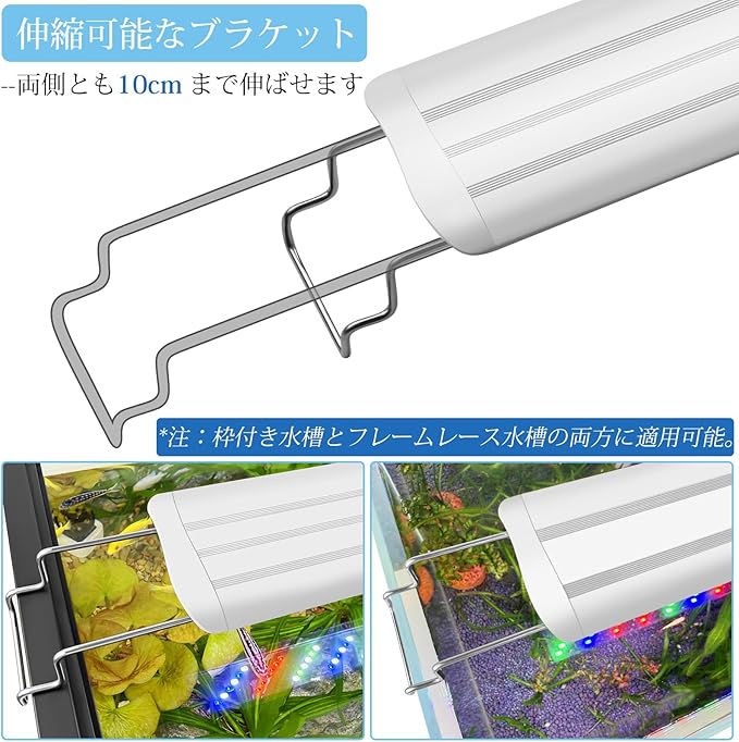 「伸縮式ステンレス鋼ブラケット」伸縮可能なブラケットを装備しており、毎側のブラケットは10 cm以上伸ばせます。枠付き/フレームレスの水槽両方に使用でき、ほとんどの水槽に簡単に取り付け可能です。