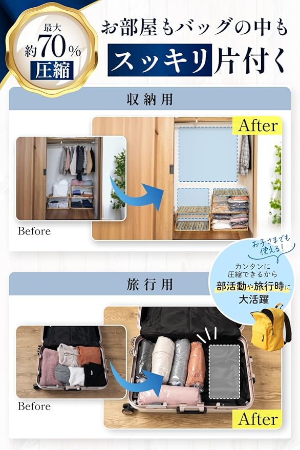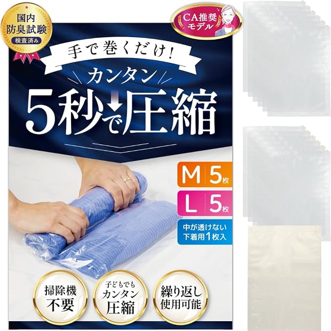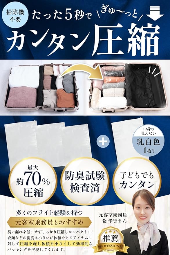 【抗菌防臭 中身が透けない下着専用袋付き 旅行で大活躍◎】 衣類圧縮袋 最大 70%圧縮 [国内防臭試験検査済み 簡単5秒で圧縮] 旅行・出張・衣替え 独自の 密閉素材