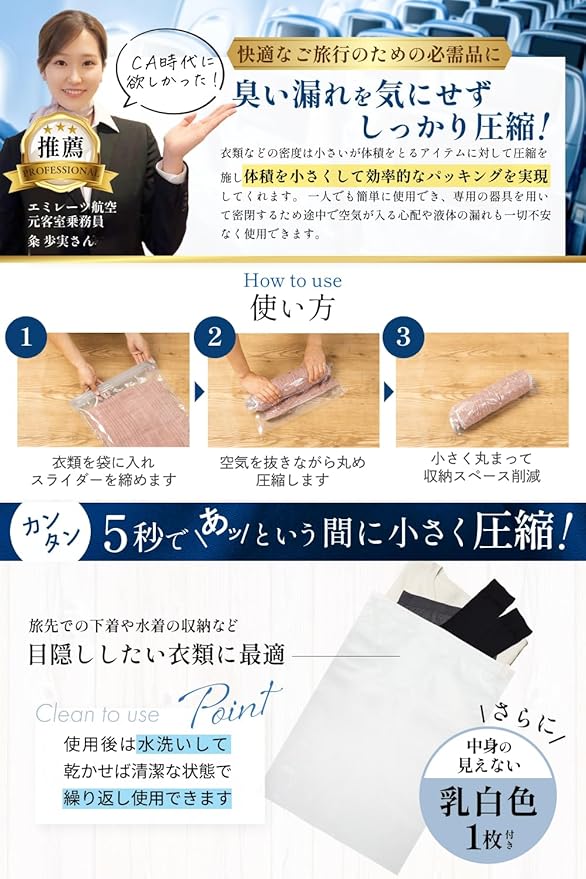 【中身が見えない下着用圧縮袋付き 】たくさんのお客様の声からいただいたご意見を取り入れました。両面乳白色の袋入りなので、下着を入れても中が見えないので旅先でキャリーバッグの整理をする際も安心です。夏はビーチへ行く際に水着を入れ、帰りは濡れた状態でも持ち帰ることができます。