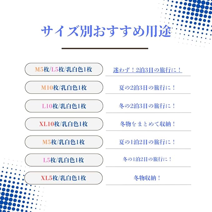 【用途に応じてサイズをお選びください!豊富な3サイズ展開】3サイズ展開しております。Mサイズは薄手のTシャツを2枚・Lサイズは厚手のセーターやズボンを1~2枚・XLサイズはダウンやコートなどを入れるのに適しています。