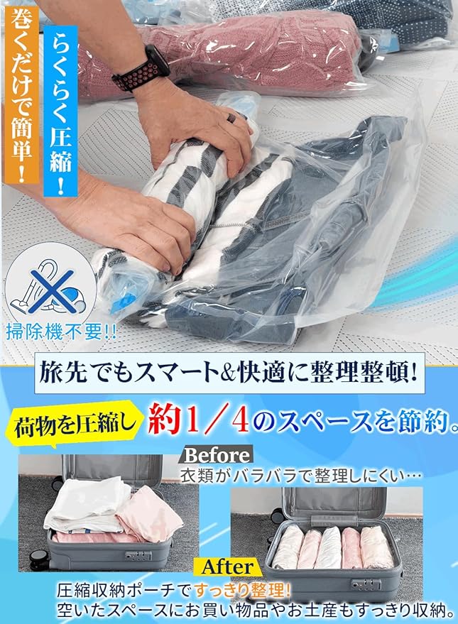 【旅行・衣替え必須!超強力圧縮】アウトドア旅行時、衣類を圧縮袋に入れると携行荷物の重量を約半分に軽減。一泊旅行でも、2〜3泊分の荷物が楽に収納可能。収納時は圧縮袋を平らに広げるだけで、セーターやコートなどの大型衣類を体積の1/2から1/4に圧縮!より整理整頓されたクローゼット空間を実現します。