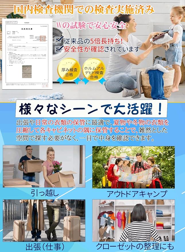 【高品質の素材、漏れ防止】厚さ80ミクロンの旅行用衣類圧縮袋。従来製品より頑丈で耐久性が5倍向上。快適性と耐久性を兼ね備えています。圧縮後も空気が逆流しにくく、荷物の長時間の膨張を防止。旅行中の荷物のずれやかさばりを効果的に防ぎ、スーツケースの空間を最大限に活用。衣類をしっかり固定して整理しやすく、出張や帰省旅行に最適です。
