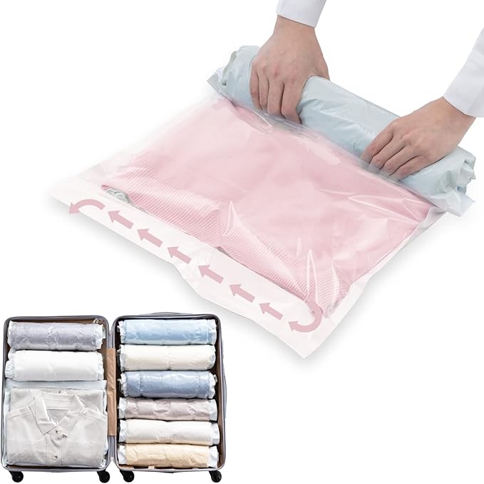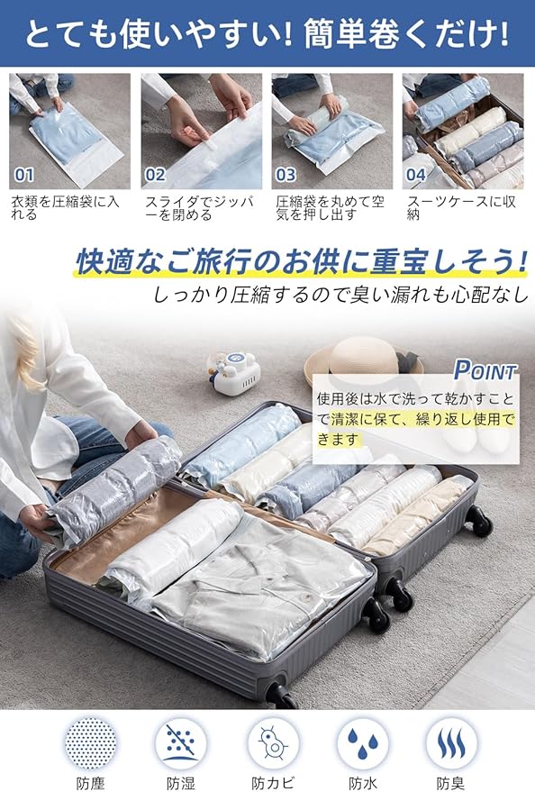 旅行者やバックパッカー向けに設計:ポンプや掃除機が不要で、手でクルクルと巻くだけで中の空気が抜けていきます。一方向排気ポート設計(バルブなし)により、空気漏れを防ぎ、圧縮直後の空気漏れを防ぎます。 掃除機いらずなので、旅行先や出張先でも使えます。とても簡単に荷造りができます