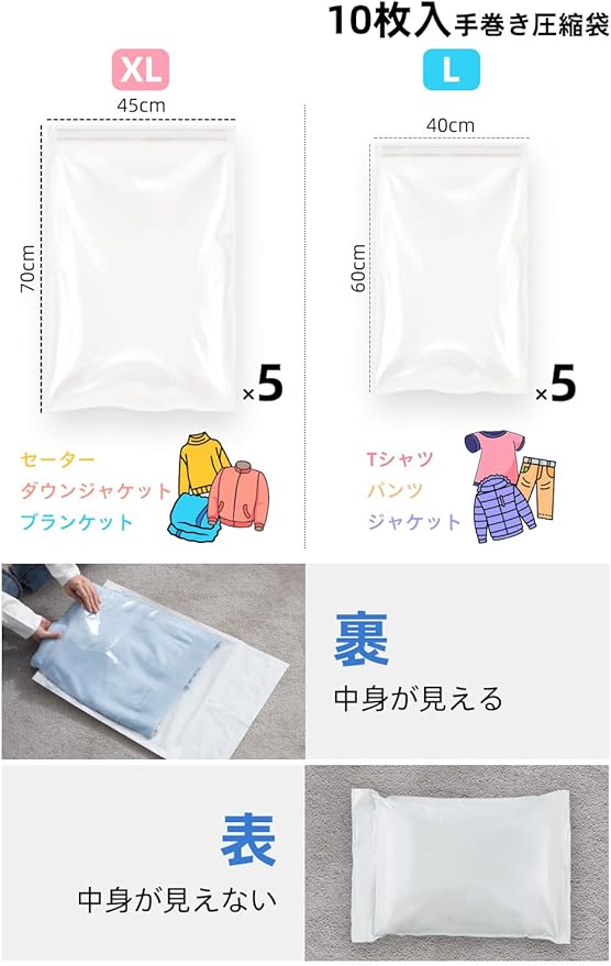 圧縮袋 旅行 衣類圧縮袋 手巻き 真空あっしゅくバッグ 衣類収納 下着 ふとん ポンプ不要 押すだけ 省スペース 再利用可能 小物収納 家庭用 引越し 出張 修学 旅行用 Lサイズ40 x 60 cm XLサイズ45 x 70 cm 10枚入 グレー