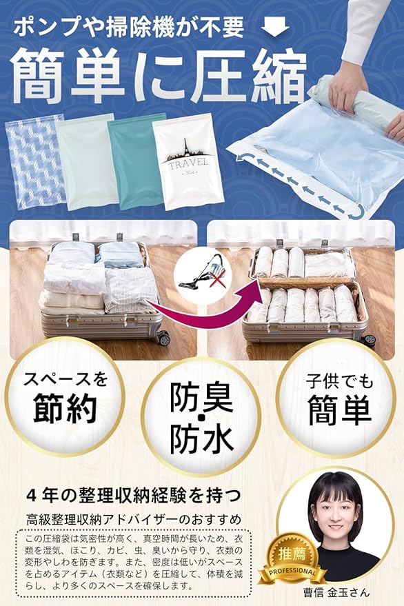 整理収納のプロ監修:高級整理収納アドバイザーの曹信金玉さん監修。プロ監修の旅行圧縮袋はラゲッジスペースになり、より多くの荷物を持ち運ぶことができます。サイズ:45*70 cm(5枚) 40*60 cm(5枚)。耐久性のある圧縮特性と、衣類、タオル、シーツ、羽毛布団、枕カバーなどの家庭用品を簡単に収納できます。圧縮袋が旅行や出張の収納ニーズを満足させます