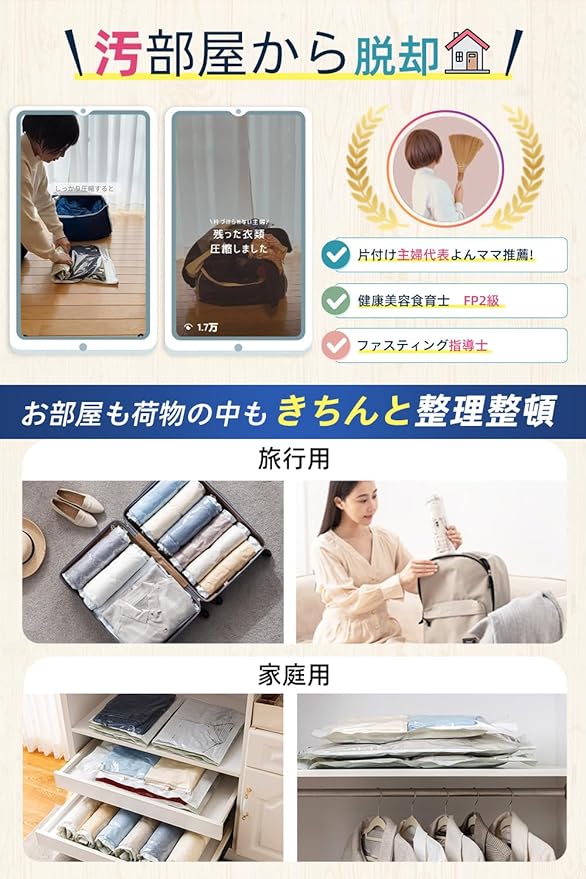 様々なシーン:寝具、タオル、衣類、化粧品、下着などの小物を収納できる圧縮袋で、旅行や出張に最適です。特に旅行の際は、きれいな服を分類して圧縮できるので、汚れた服ときれいな服を分けるのに適しています。衣類を清潔に保ち、もう旅行の時に大荷物にならずに済みます!特に梅雨時期は、収納した衣類が濡れる心配もありません